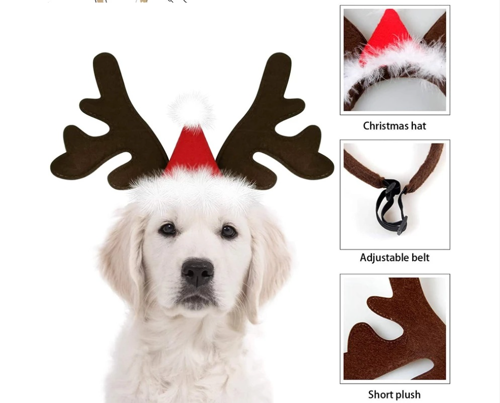 Featuring an adorable reindeer headband with plush brown antlers and a bright, jolly Santa hat, this festive accessory gives your pet the perfect seasonal glow-up — cute, charming, and absolutely photo-ready.